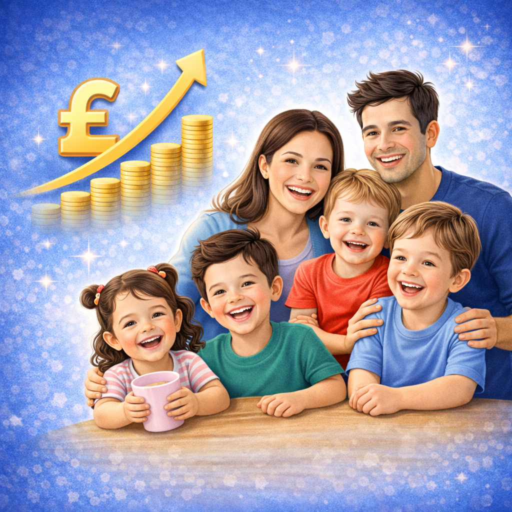 Maximum help for larger or higher-need families. Includes 30 hours free childcare per week (9 months–4 years, expanded 2026) + free school meals/breakfast clubs + higher UC childcare cap (+£736 per extra child above 2). Full protection for your children’s future.